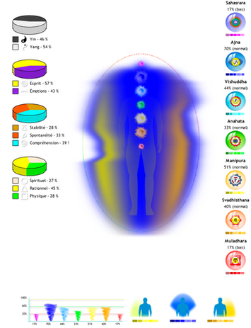Avant le soin proprement dit, une première lecture énergétique est effectuée à l’aide de l’appareil AuraBook, qui permet de visualiser l’état de vos chakras, de votre aura et de vos énergies globales. Cette analyse offre une image précise et objective de votre état énergétique du moment et d'identifie quels chakras sont ouverts, bloqués, trop actifs ou en sous-activité.